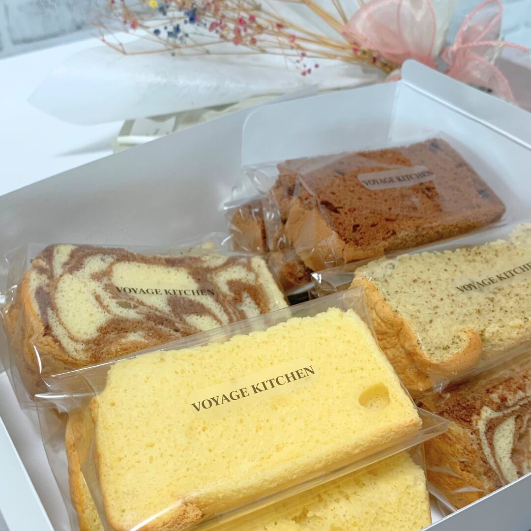 プレーン、アールグレイ、ショコラマーブル、コーヒーマーブル、抹茶、ココアチョコチップ、チョコバナナ、キャラメルの中からお好きなシフォンを6種類をお選びください。